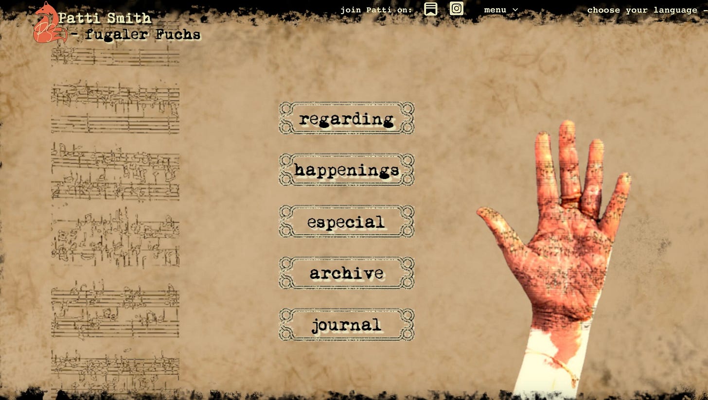Playback speed×Share postShare post at current timeShare from 0:000:00/0:00Transcript56013314A message and some thoughtsA link for a new global website Patti SmithJul 16, 202456013314ShareTranscript0:00-5:14Audio playback is not supported on your browser. Please upgrade.FUGALFOX WEBSITEScreen shot of fugal fox home page. Janine BubbPatti Smith is a reader-supported publication. To receive new posts and support the work, consider becoming a free or paid subscriber.SubscribeDiscussion about this videoCommentsRestacksPatti SmithThe reader is my notebookThe reader is my notebookSubscribeListen onSubstack AppRSS FeedAppears in episodePatti SmithRecent EpisodesSeasons GreetingsDec 20 • Patti SmithMeasuring up?Dec 17 • Patti SmithOzuDec 13 • Patti SmithNight FollyDec 10 • Patti SmithHello from my homesteadDec 4 • Patti SmithA thank you and an accidental commercialNov 26 • Patti SmithWiped out rehash (warning: slow moving)Nov 24 • Patti SmithHello from the BeaconNov 22 • Patti Smith