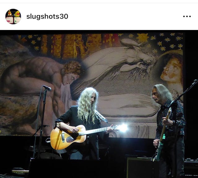 Normally we don’t have visuals, any special effects at all. But I decided to show images for certain songs and though I don’t always see them, I could feel their impact. Below is Lenny Kaye and I during My Blakean Year, with images of William Blake. I borrowed it from our friend Karen’s Instagram @slugshots30. She always takes great shots of the band and the surrounding town we’re playing in.