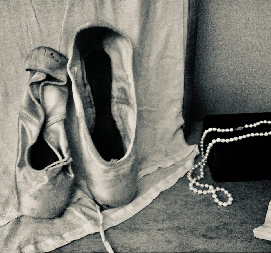 Sometime ago I obtained a pair of Margot Fonteyn’s slippers. Very worn, faded flesh tone, containing remnants of the blood and sweat of the prima ballerina. I have photographed them many times. Whether the image was as I hoped for or not, the sense of her, a lithe though muscular and feminine force, seemed to emanate from them. Occasionally I would add some precious object to speak of aspects of my own nature. In this image I included a strand of pearls given to me by my husband. I cherish them and the memory of opening the black velvet case he presented to me on our anniversary. There is no particular reason why I am writing this; I sat down and this is what I wrote. Perhaps to remind myself, as I must, that this troubled world is not the only world. There are multiple worlds, and tonight this is one of mine. One containing beauty and mourning. A lost love, lost youth or one’s own dexterity.