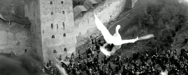 The film opens with a breathtaking prologue wherein a visionary peasant with the heart of Leonardo successfully flies in a makeshift air balloon, beholding a panorama from a perspective that none have seen before, save the birds, or perhaps Icarus and ascending saints. The sequence closes with a dark horse rolling on his back then slowly rising by a glistening pond. Andrei Rublev appears in the first part called The Jester Summer 1400. We see him from above, reluctantly leaving his monastery, questioning the validity of his artistic path. As he tramped through heavy rains I felt his shivering body beneath his coarse robes. Pelted by a sad splendor, I was thinking.