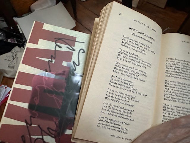 Well another ramble but this time with added last minute excitement. I suddenly figured out how to reverse the video so the book titles aren’t backwards. The rest is just usual hanging out stuff including a note about dental floss and eight lines of Baudelaire.