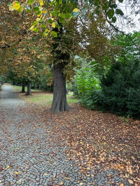 Taking a quiet ritual stroll in Berlin through the small forest cemetery, watched over by the benevolent lady of the urban fields. On one side is nature is all but silete, on the other the muted traffic, very much like the sound of the sea.