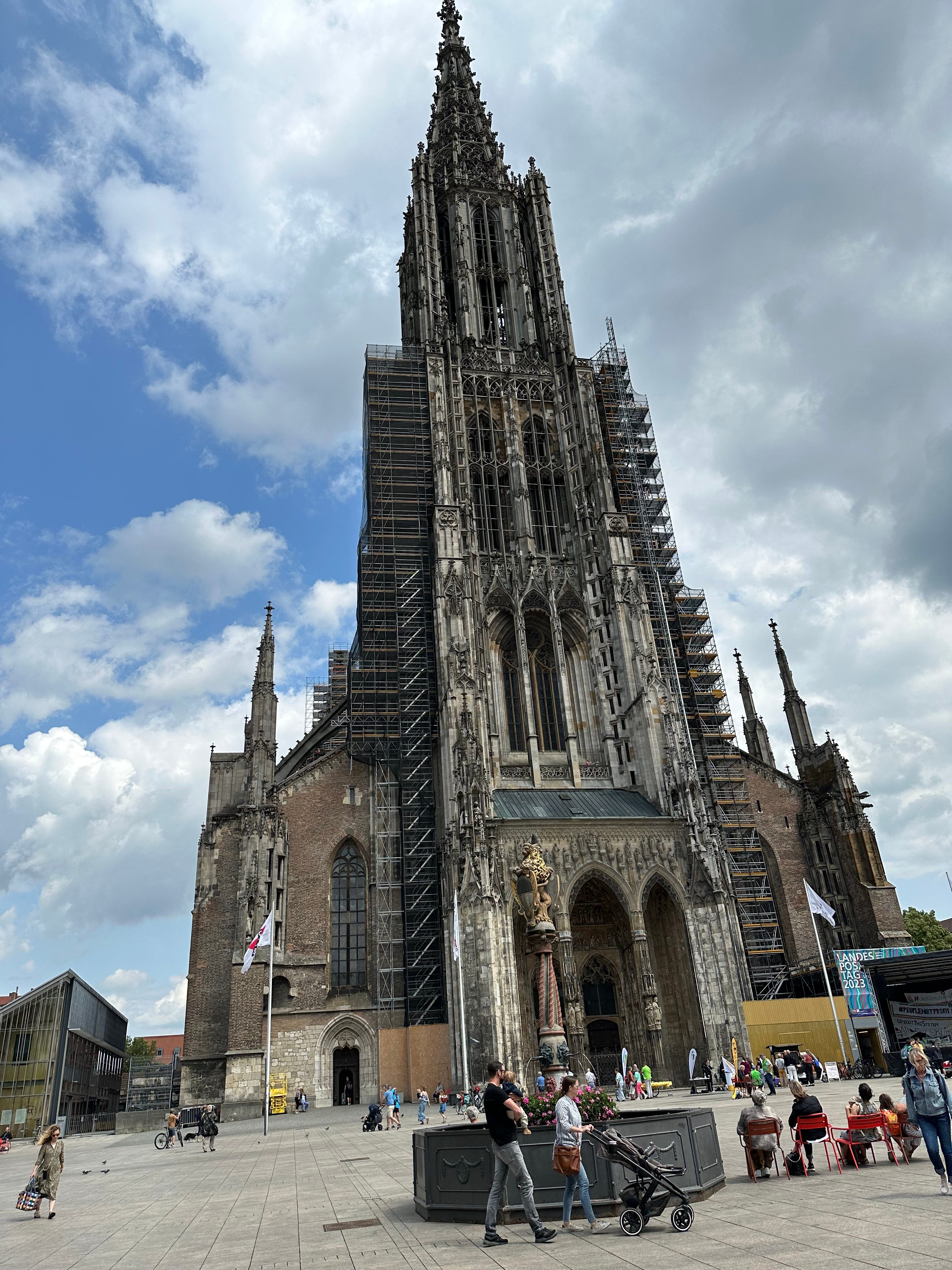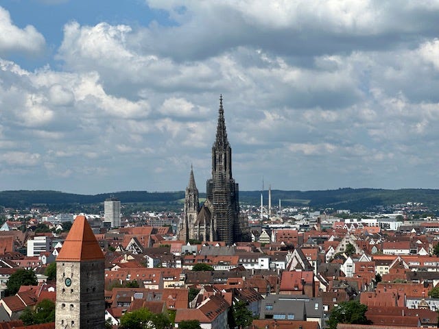 The Gothic Ulm Cathedral soars above the Danube River with the world's tallest church spire, towering 530 feet above the ground. Climbing the 768 steps to the top of the main spire rewards one with beautiful panoramas across Swabia and neighboring Bavaria. The massive Gothic cathedral was begun in 1377 and was completed 1890. The cathedral was a silent witness to Albrecht’s attempt to fly.