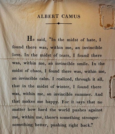 She sent it to me and I thought it would be nice to read you the words of Albert Camus, as they are very heartening. I send all good wishes with hopes everyone is safe after the terrible storms weathered.